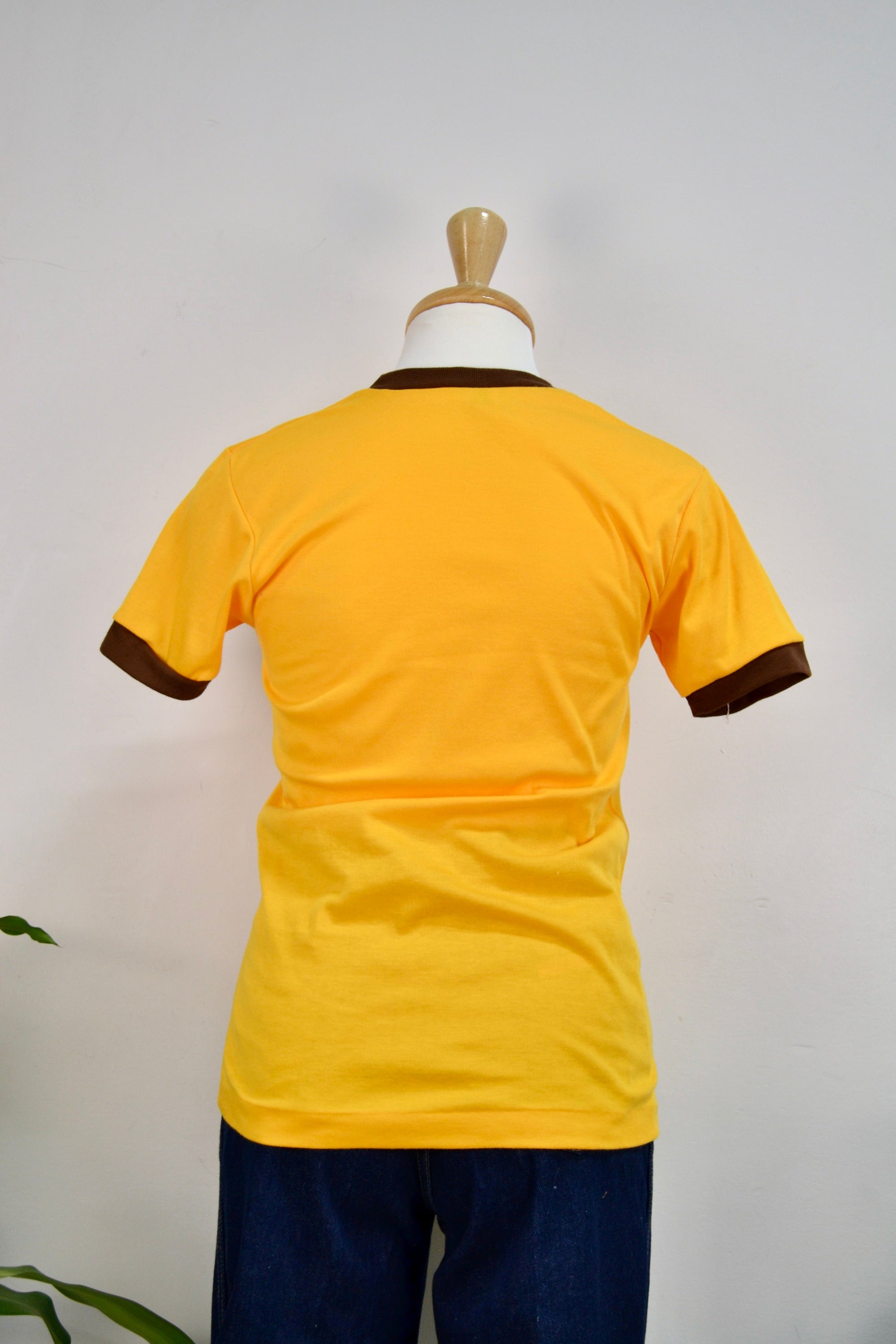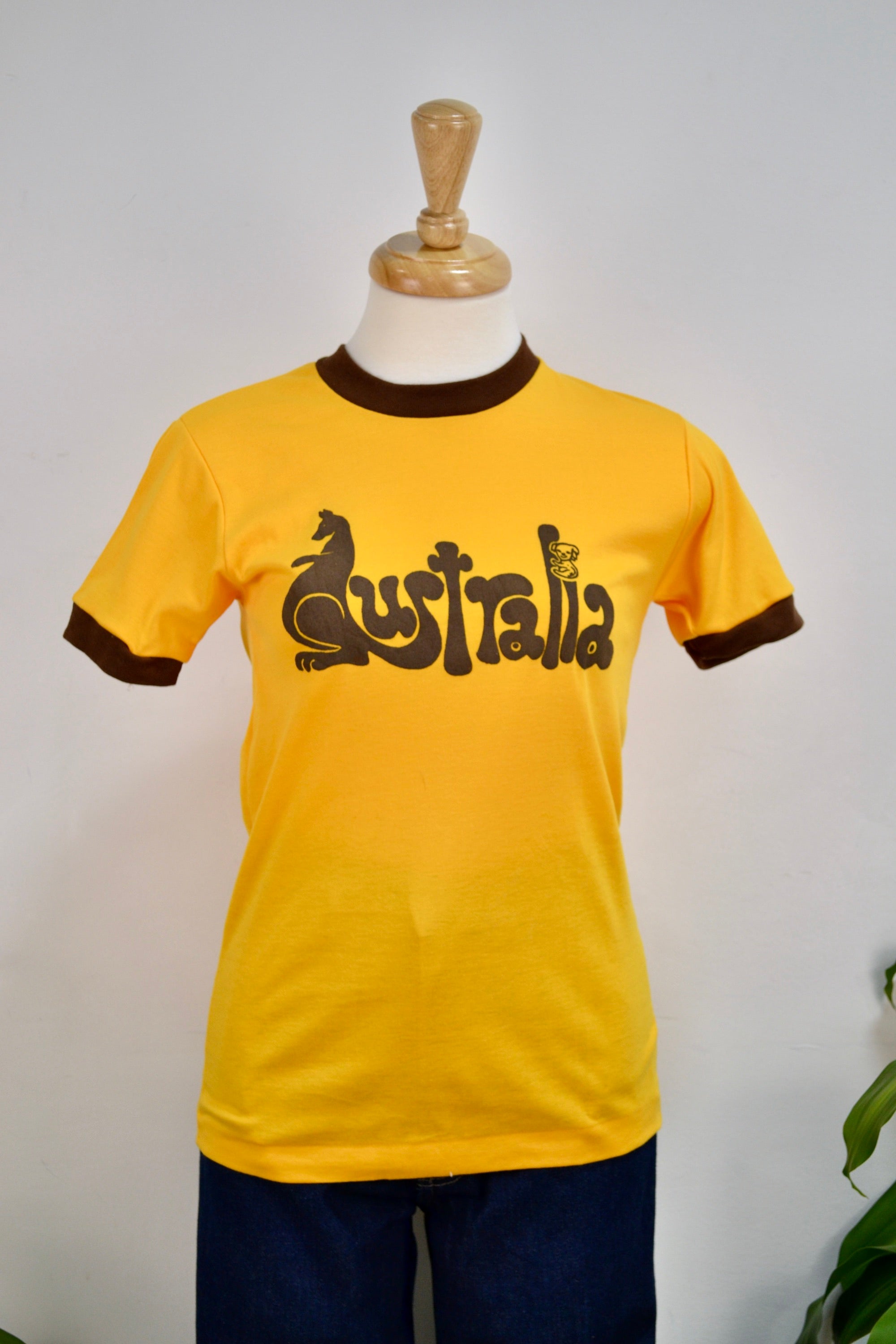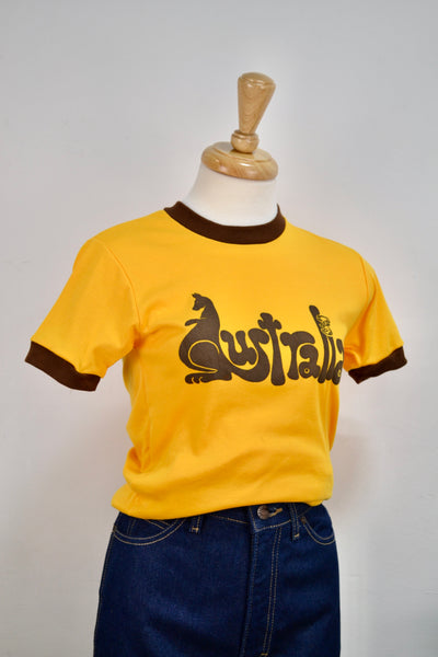 Seventies Yellow and Brown Australia Tourist Ringer Tee. Single Stitch Hem.