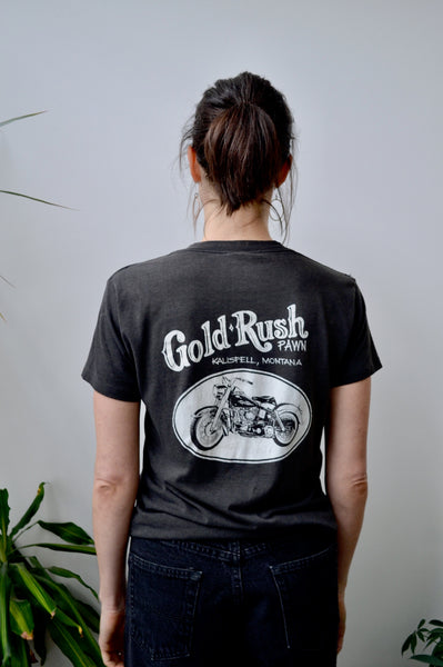 Faded Black "American Classics, Gold Rush Pawn, Kalispell Montana" Harley Davidson Tee. Single Stitch. 1988 3D Emblem.