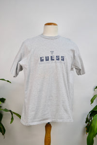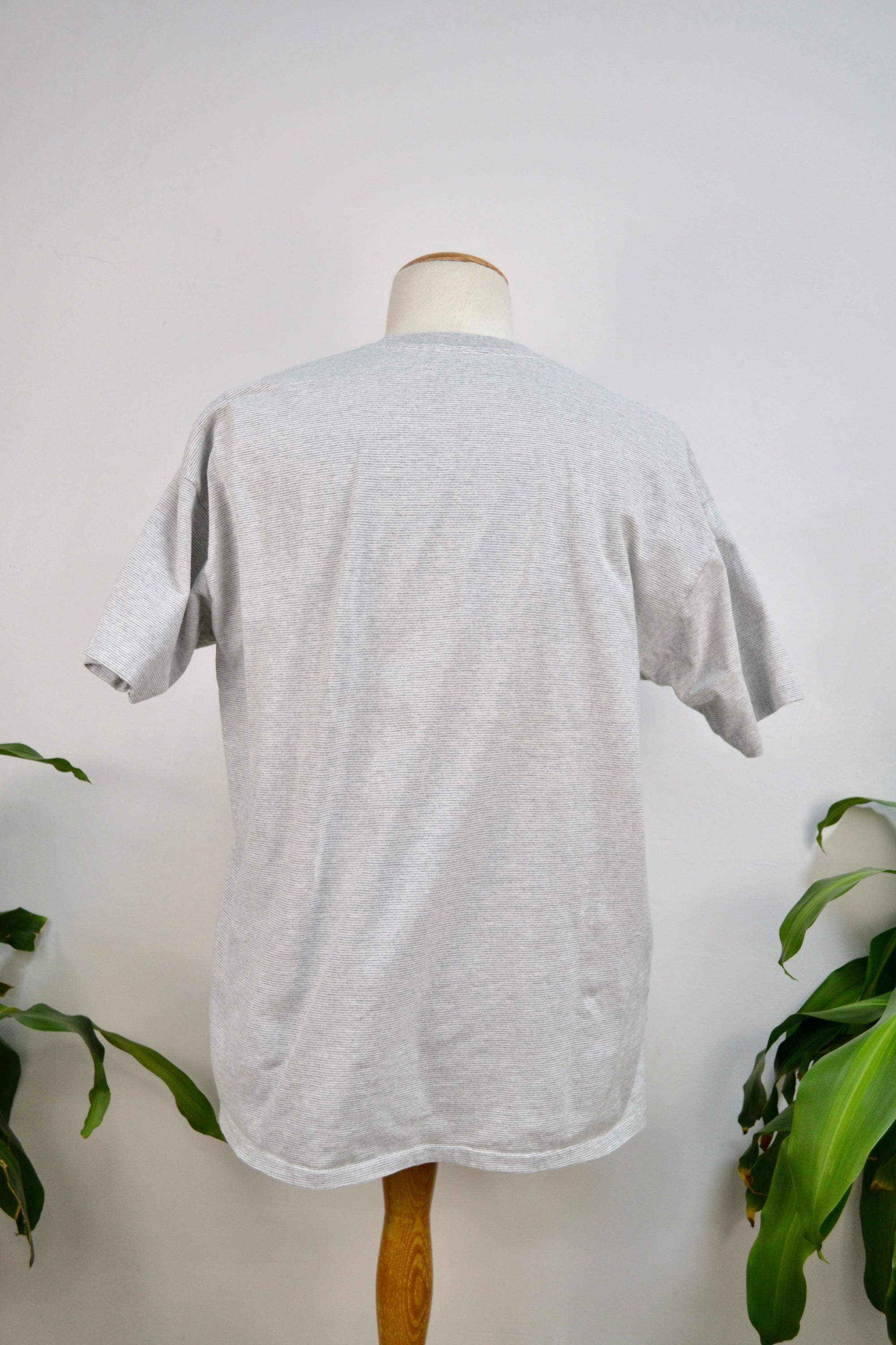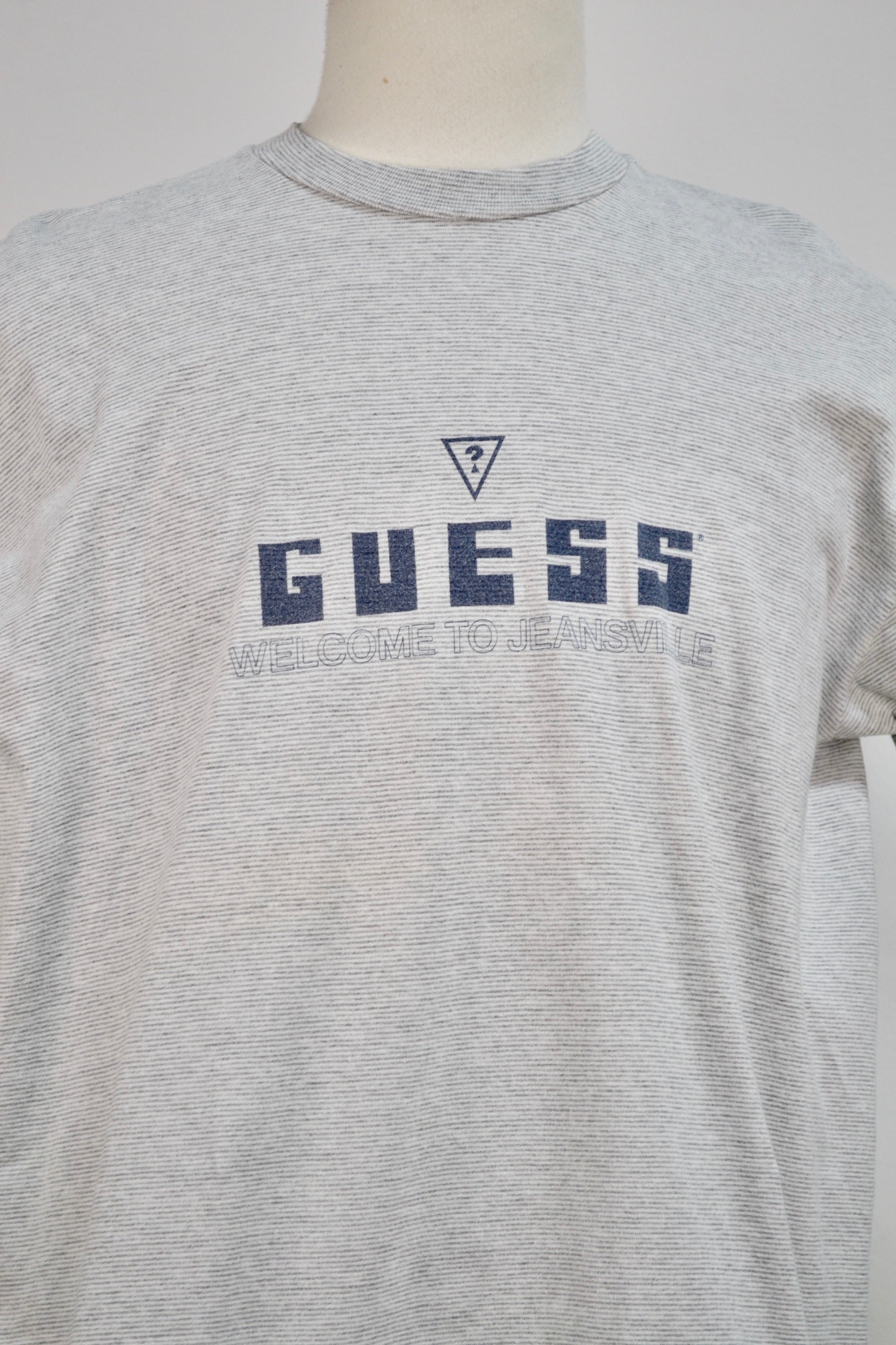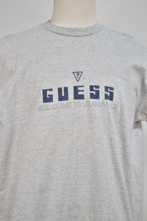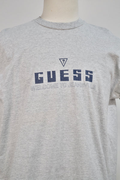 Nineties "Guess Welcome To Jeansville" Gray Striped Single Stitch Tee.