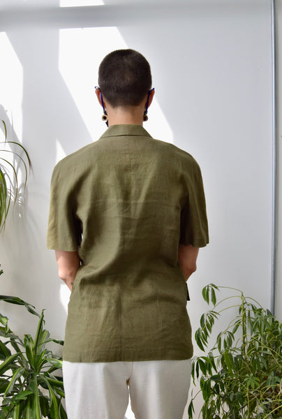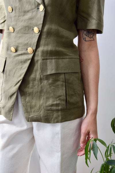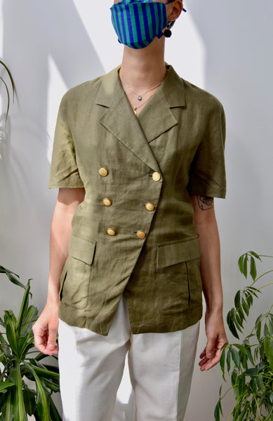 Olive Linen Blazer Top. Collared. Double Breasted Button Closure. Two Hip Pockets. Unlined.