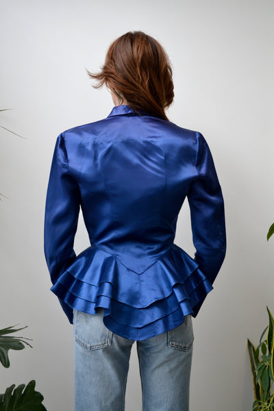 Forties Royal Blue Satin Peplum Blouse. Tiered Peplum. Shawl Collar. Button Closure in Front. Tailored. Unlined. Cuffable Sleeves With Snap Button Closure.