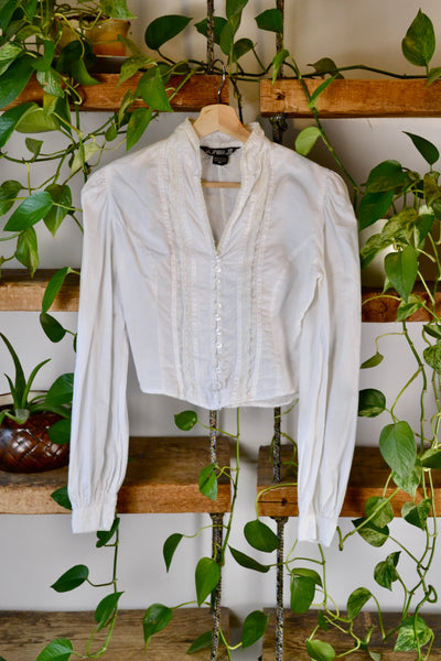 Vintage Eighties "Romantique" White Indian Cotton Edwardian/Prairie Inspired Blouse. Button Closure in Front. Unlined. Band Collar. Mutton Style Sleeves.