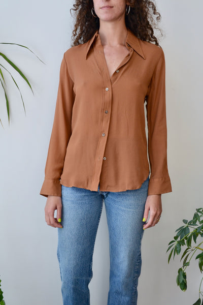 Vintage 1970s "Raphael Jouet" Light Brown Button Up Blouse. Semi Sheer. Pointed Collar. Unlined.