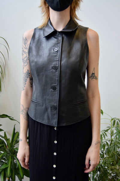 90's Black Leather Vest Top. Collared. Button Closure Along Front. Darted Waist. Two Mini Pockets. Lined.
