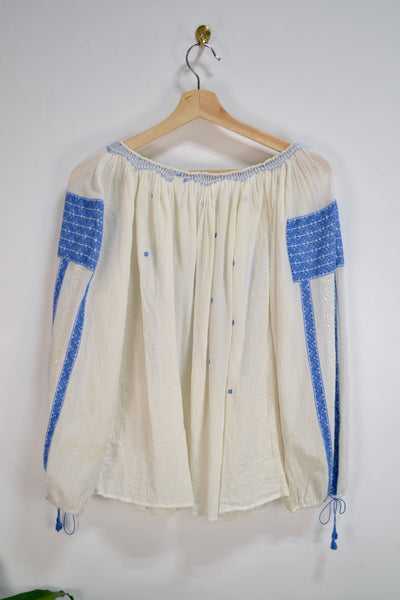 Vintage Embroidered Gauzy Peasant Blouse. Unlined. Semi Sheer. Tie Closure Neckline. Raglan Sleeve.