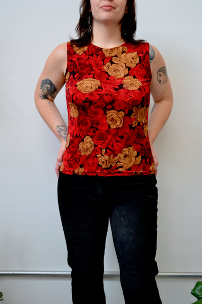 Early 2000s Rose Patterned Slinky Sleeveless Top. No Closures. Unlined.