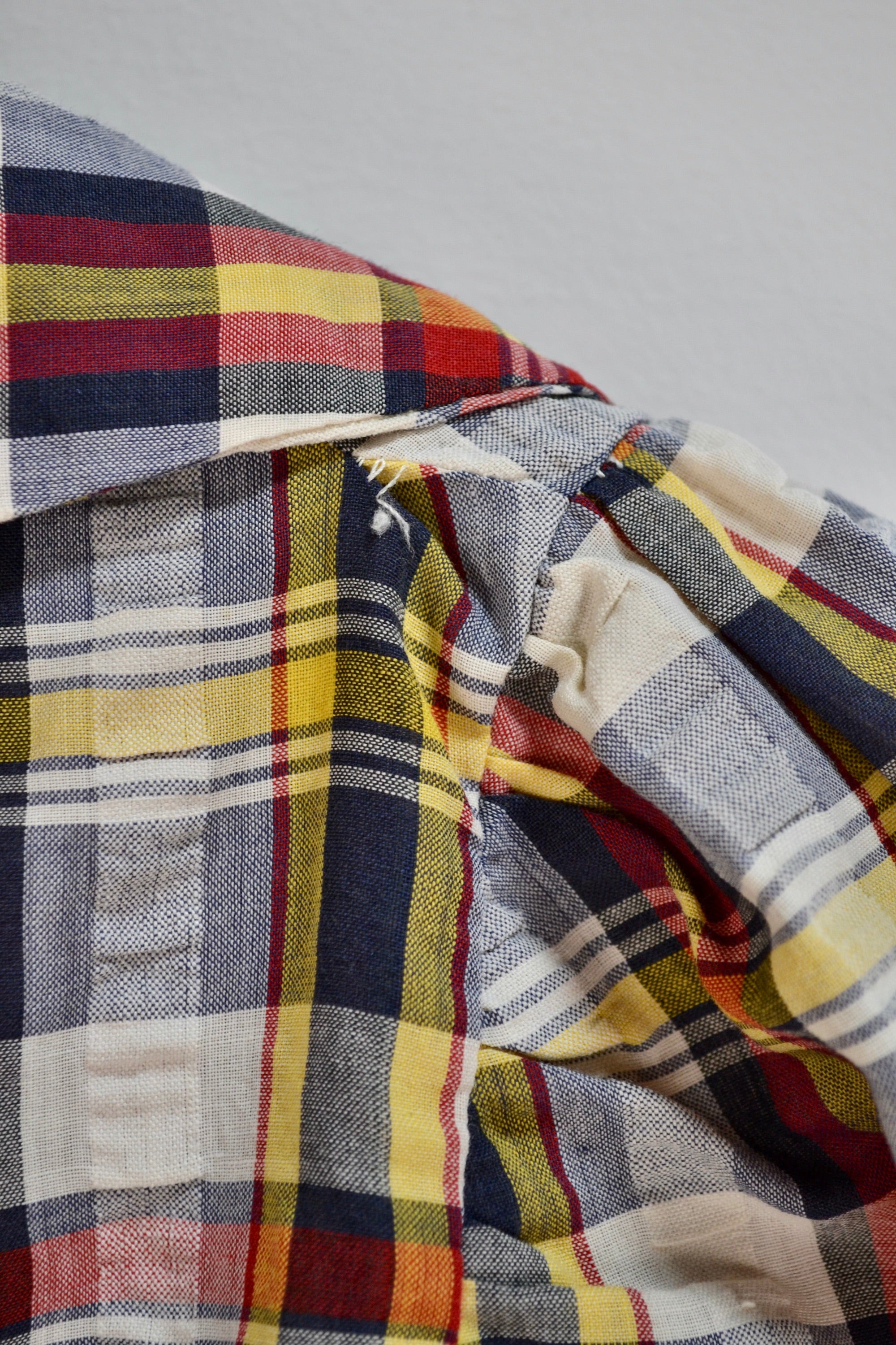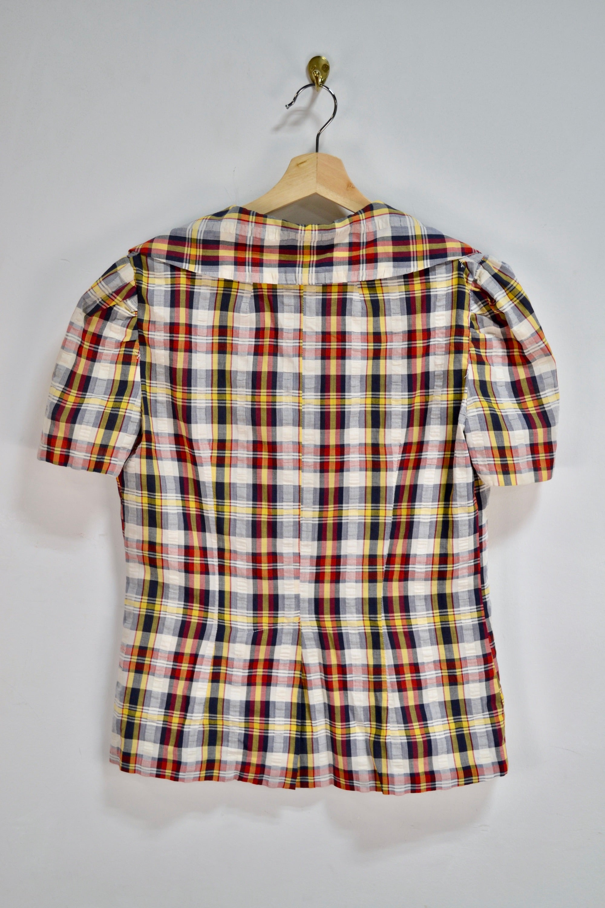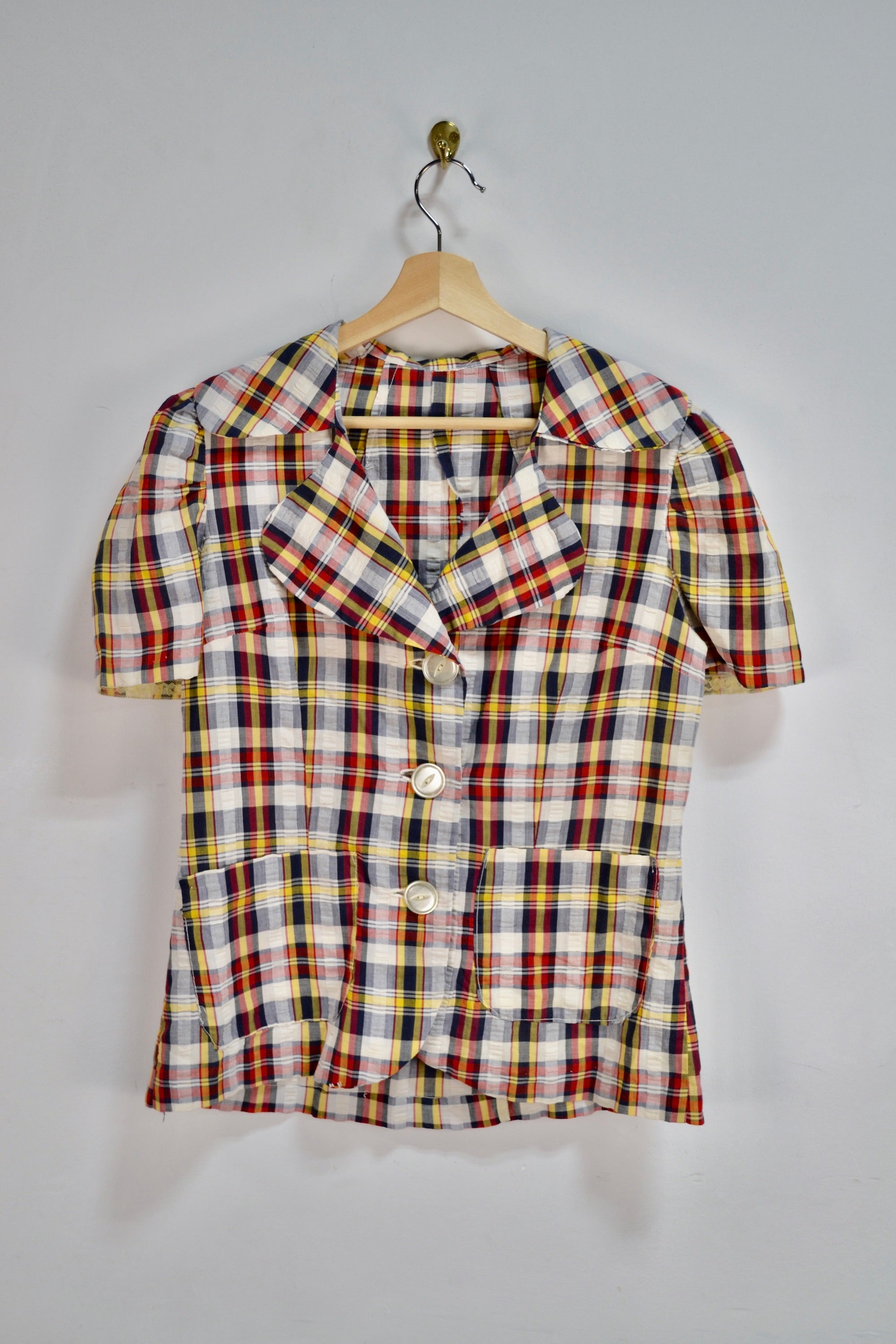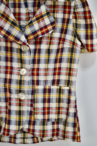 Vintage Fifties (?) Handmade Seersucker Plaid Blouse. Notched Oversized Collar. Unlined. Button Closure in Front. Short Puff Sleeve. Two Pockets.