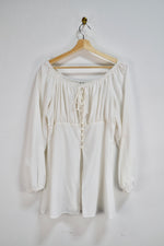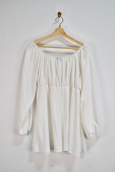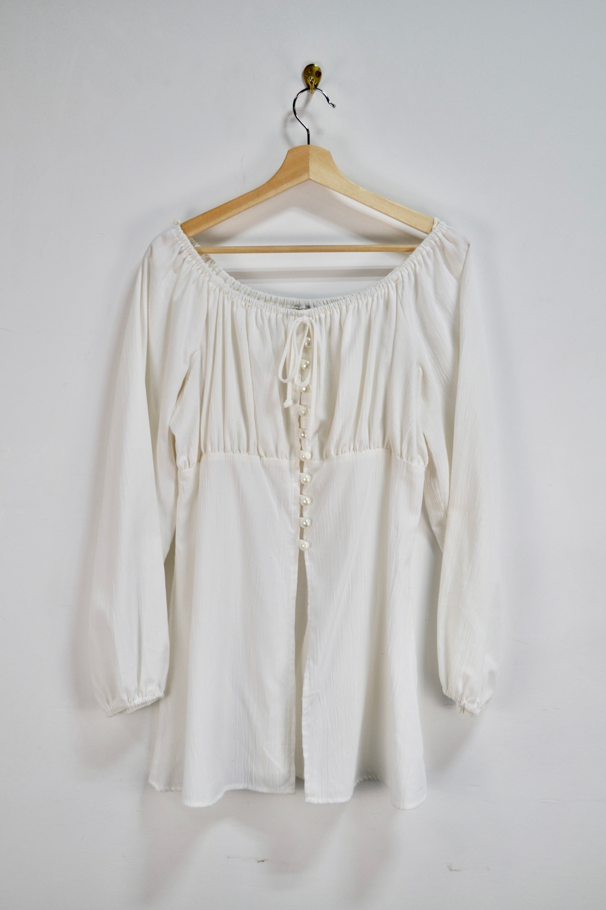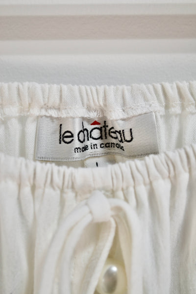 Nineties/Aughts "Le Chateau" White Peasant Blouse. Elastic Collar. Raglan Puff Sleeves With Elastic Cuffs. Half Button Closure, Half Open Front.