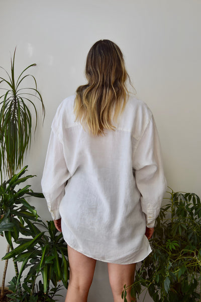 Long Sleeve White Ramie Button Up Top With Single Breast Pocket.