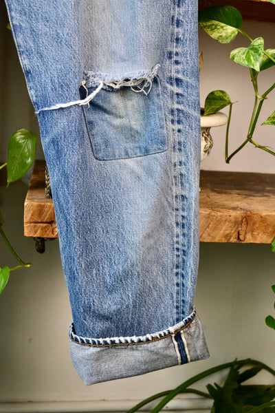 Good Vintage Condition - Thrashed, Knee Rip and Patch, Crotch Hole Mended, Marks Throughout