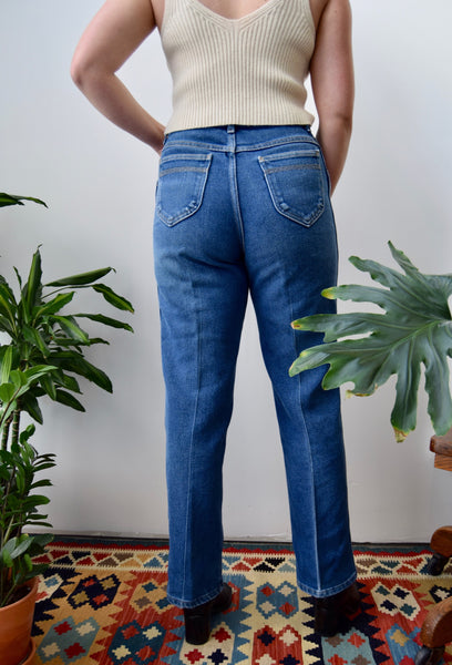 Dark Wash Straight Leg Jeans. Five Pocket. Slight Stretch. Zipper Fly And Button Waist.