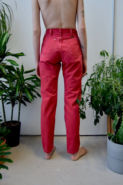 Red Wrangler Jeans. High Waist. Straight Leg. Zipper Fly. Two Hip Pockets, Two Back Pockets.