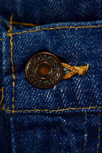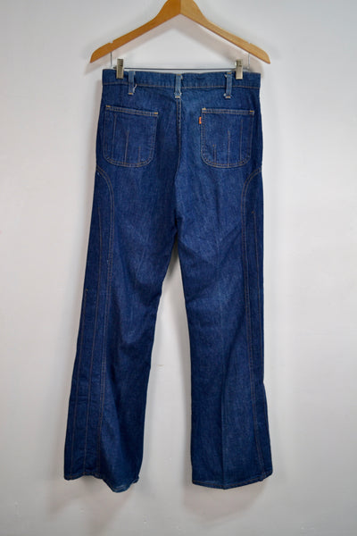 Vintage Seventies Dark Wash Levi Feather Tab Jeans. Stripe Stitching Along Sides. Talon Zipper Fly With Button Closure. Slightly Flared Leg.