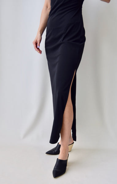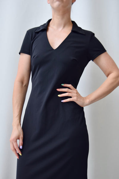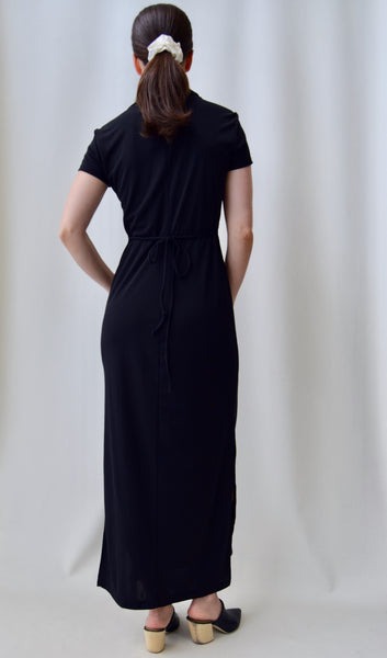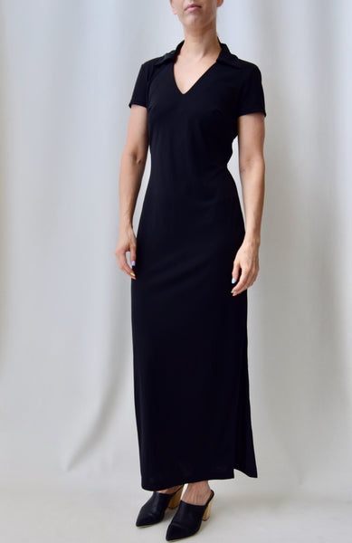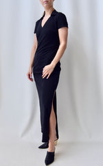 Long Black Dress With Polo Style Collar, Tie At Waist For Cinching And High Leg Slit.