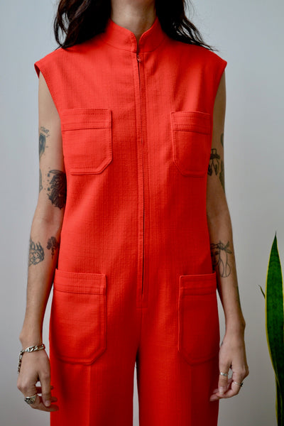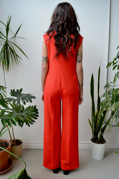 Sixties/Seventies "Butte Knit" Reddish Orange Jumpsuit. Wide Leg. Sleeveless. Band Collar. Talon Zipper Closure in Front. Four Pockets. Unlined.