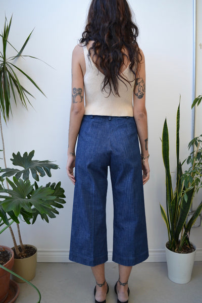 Sixties/Seventies Dark Wash Denim Wide Leg Culottes. High Waist. Zipper Fly With Snap Button Closure at Waistband. No Pockets.