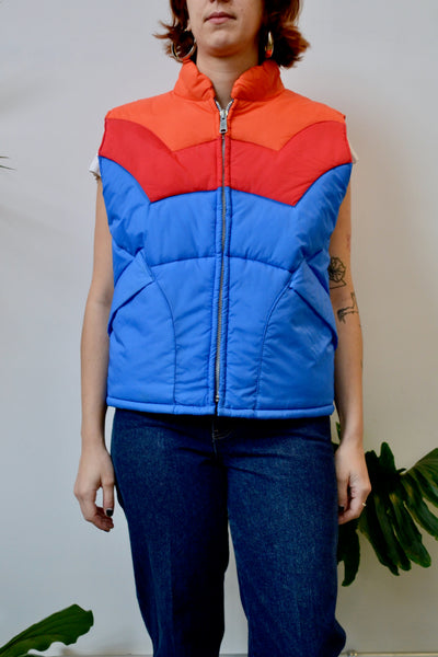 Seventies/Eighties "Weather Watcher" Colorblock Puffer Vest. Zipper Closure in Front. Mock Neck. Lined. Filled. Two Pockets.