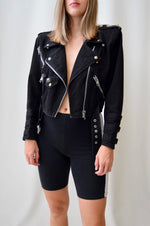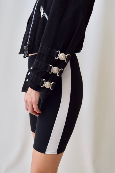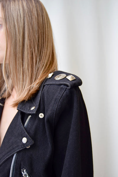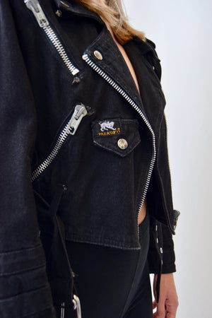 Motorcycle Style Denim Jacket. Grommet Detailing On Shoulders And Sleeve Cuffs. Multiple Pockets, Including Two Waist Pockets. Front Diagonal Zipper, Belt At Waist. Large Metal Patch On Back.