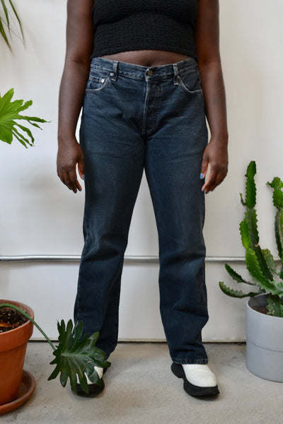 1990s Black Wash Levi's. Low/Mid Rise. Straight Leg. 5 Pockets. Hidden Button Fly.