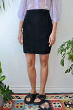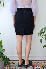 Eighties "Smart Set" Black Suede Mini Pencil Skirt. Zipper Closure Up Back. One Back Pocket. Lined.