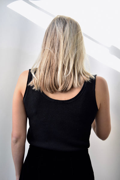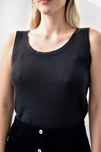 Black Cropped Waffle Tank Top. Neckline And Armhole Trim.