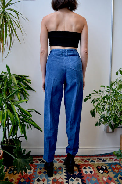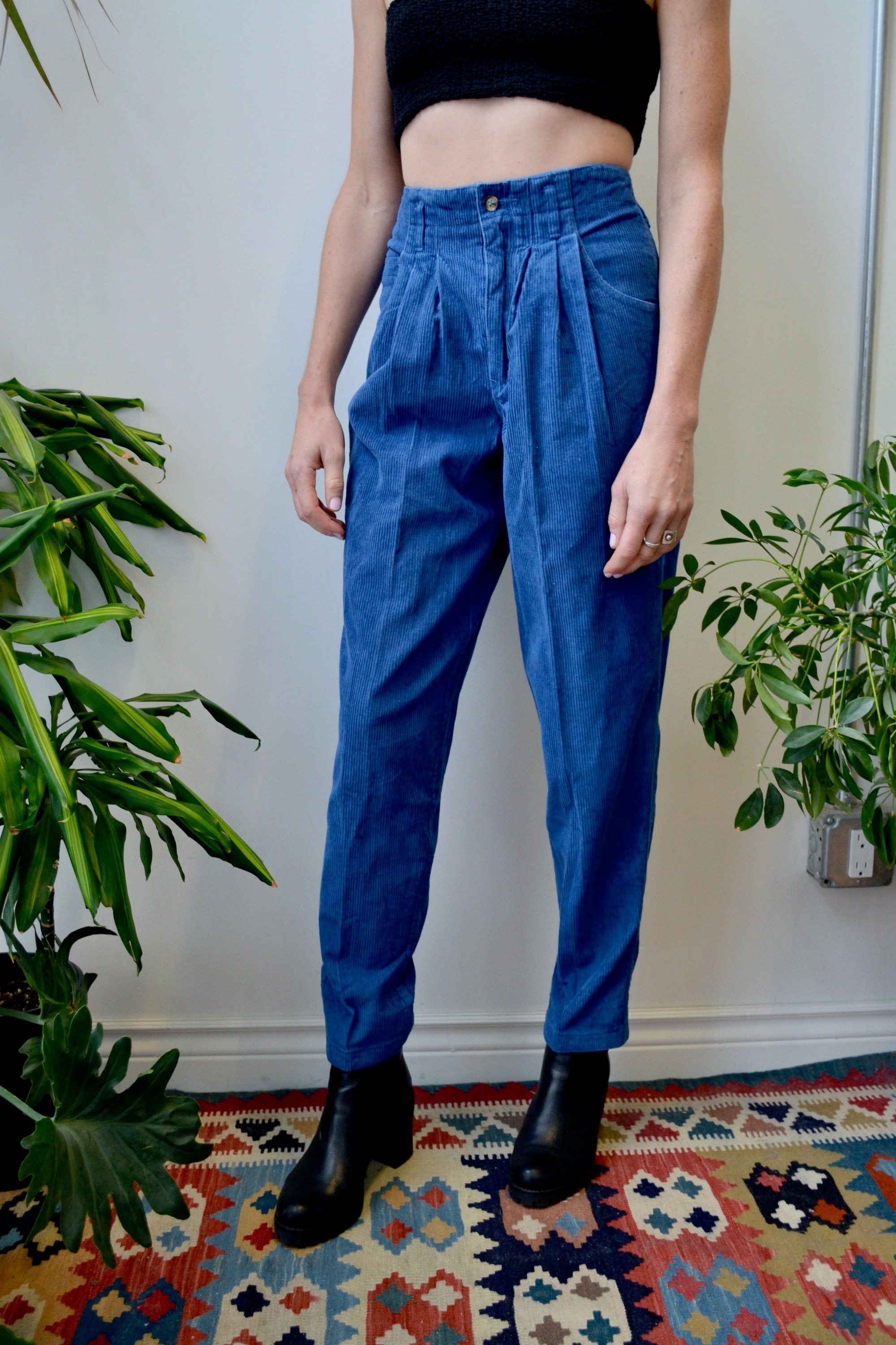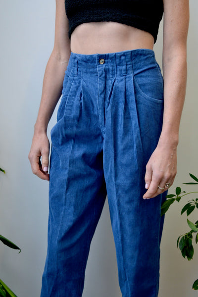 Blue Corduroy Trousers. High Pleated Waist. Zipper Fly. Tapered Leg. Four Pockets.