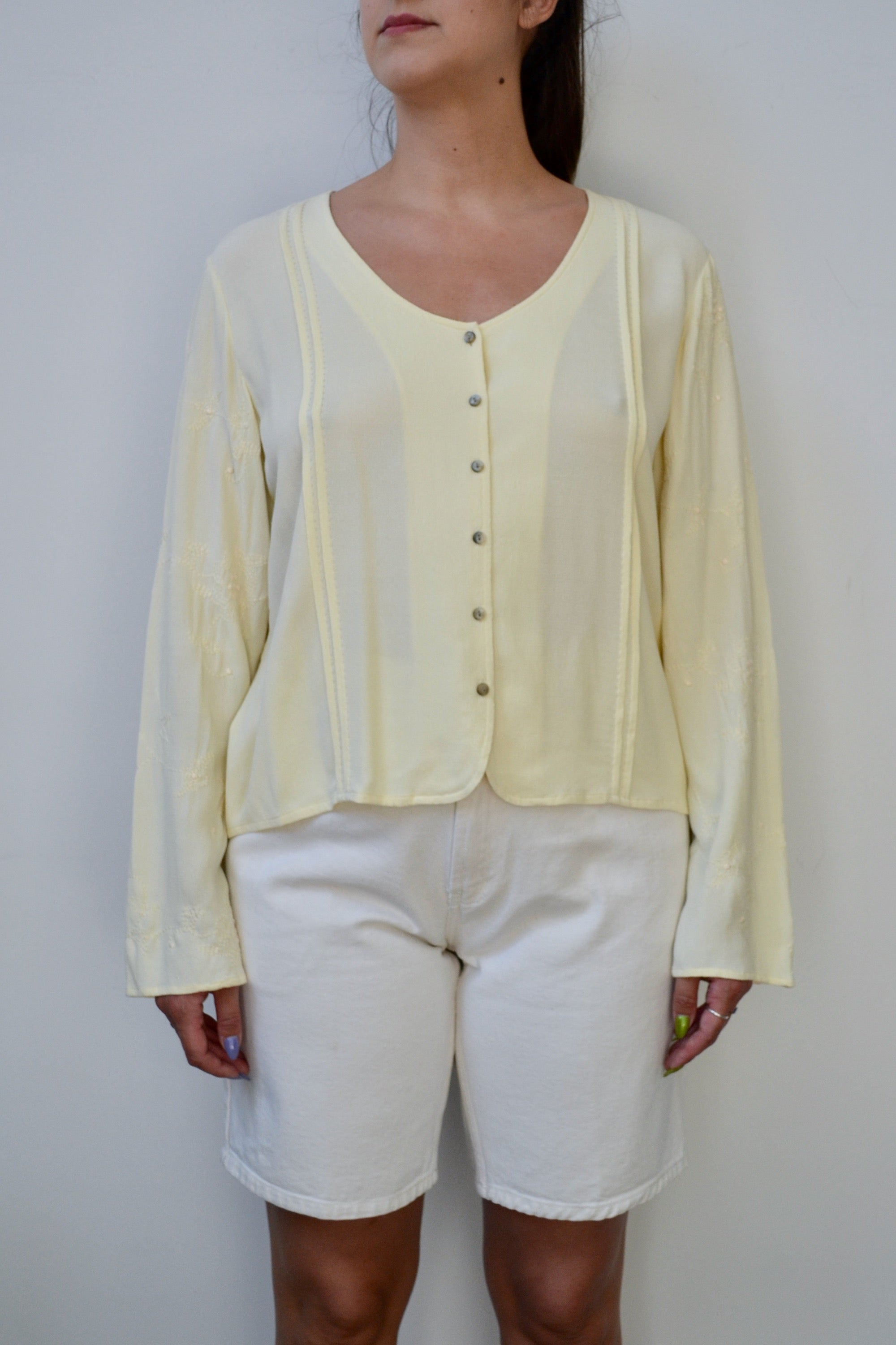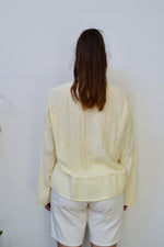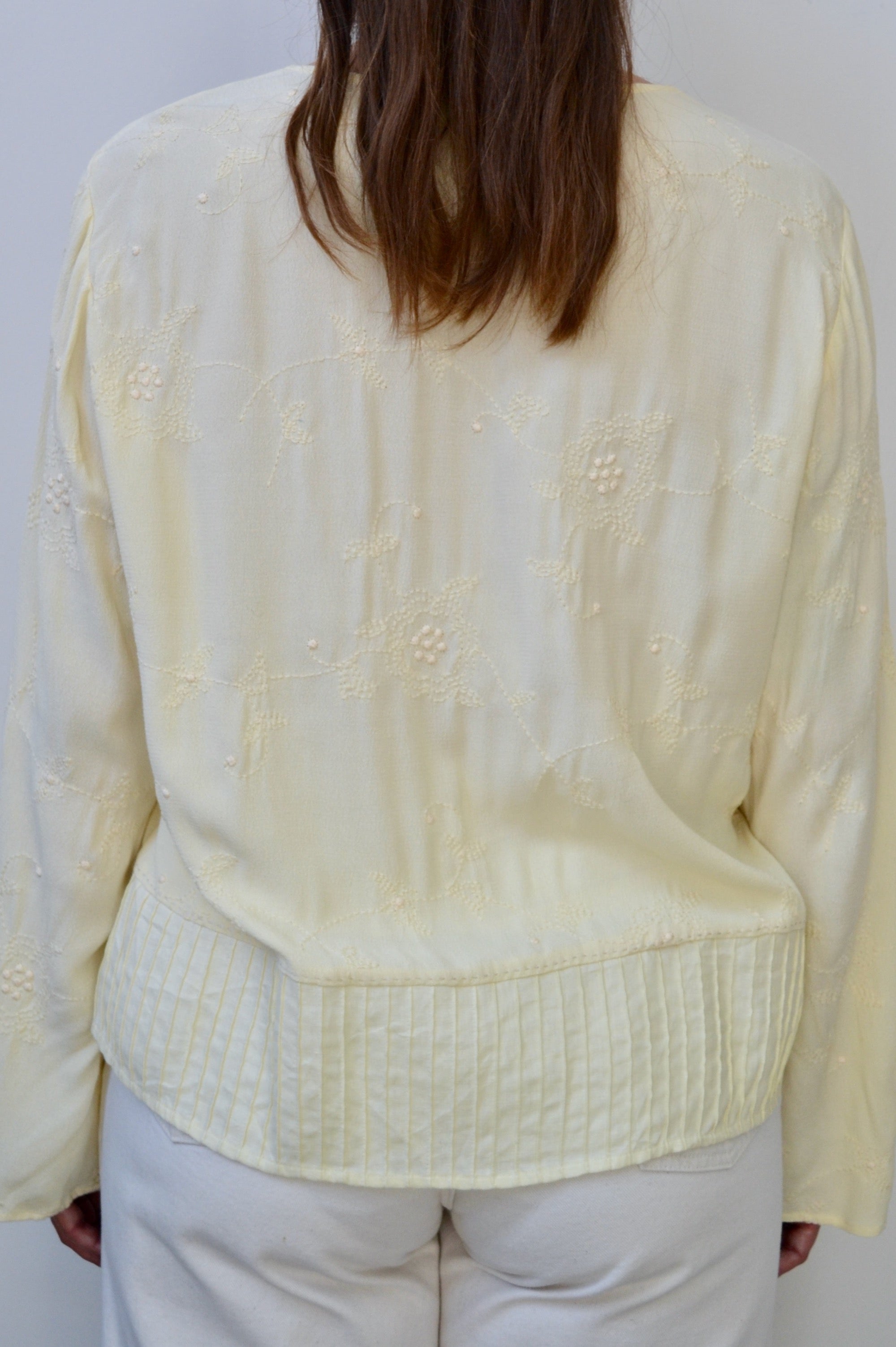 Nineties Butter Yellow Blouse. Button Closure Up Front. Knife Pleats On Front. Embroidered Sleeves and Back. Knife Pleated Linen Panel Bottom Back. Unlined.