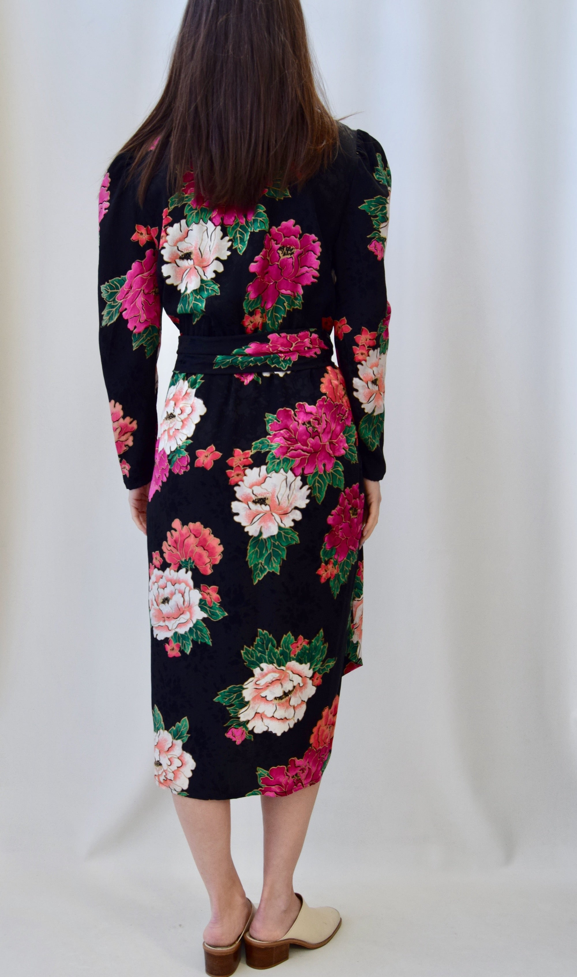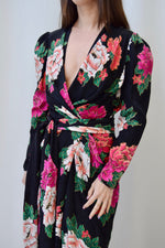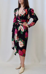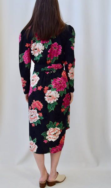 1980's Black Silk Dress with Multi Pink Carnation Print. Faux Wrap with Button Closure. Sash Belt. Puffy Shoulder. Lined.