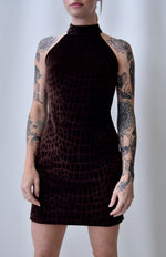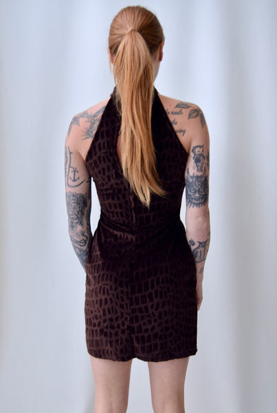 Nineties Chocolate Brown Velvet Bodycon Dress. High Neck. Unlined. Zipper Closure Along Back.