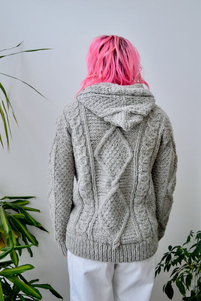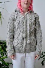 Chunky Knit Light Grey Wool Hooded Sweater. Zipper Closure Up Front. Bobble Drawstrings. Unlined.