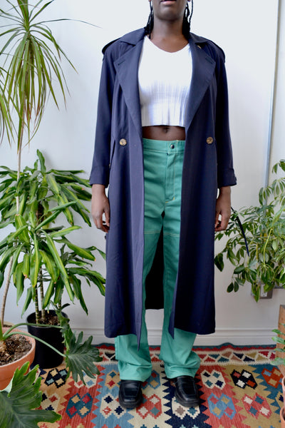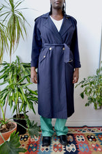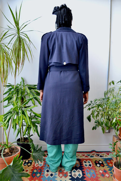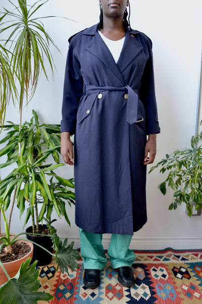 "Jones New York" Navy Blue Wool Trench Coat. Removable Wool Lining (zip in). Raglan Sleeve. Two Hip Pockets. Shoulder Pads. Belt. Second Layer Nylon Lining.