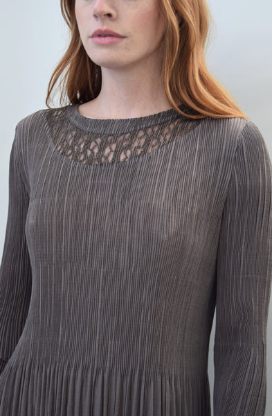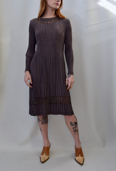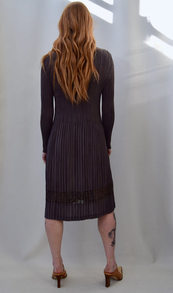 Cocoa Brown Pleated Midi Dress. Collarless. Peekaboo Lace Detail at Collar and Skirt Hem. Unlined. No Closures. Stretchy.