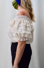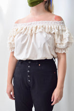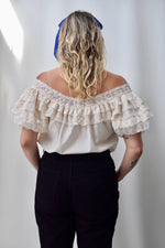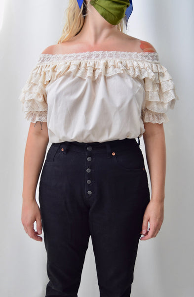 Vintage 70's Off Shoulder Top. Ultimate Puff Lace Sleeve. Lace Collar Detailing. 35% Cotton 65% Polyester.