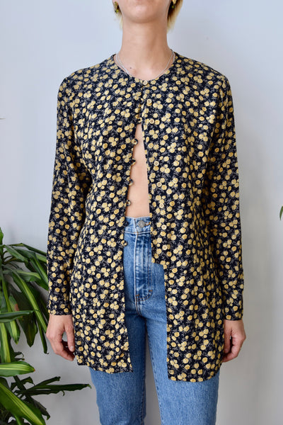 Nineties Floral Tunic Blouse. Loop Button Closure Up Front With Open Bottom. Darted Waist. Unlined.