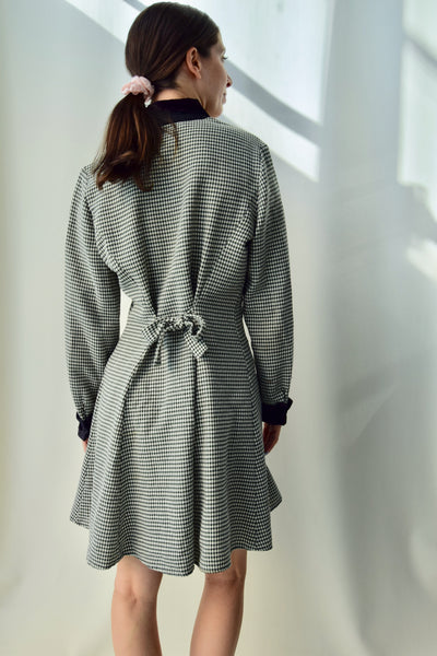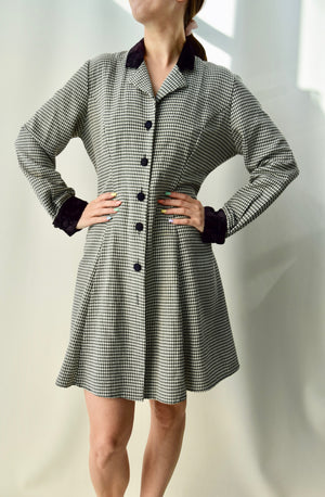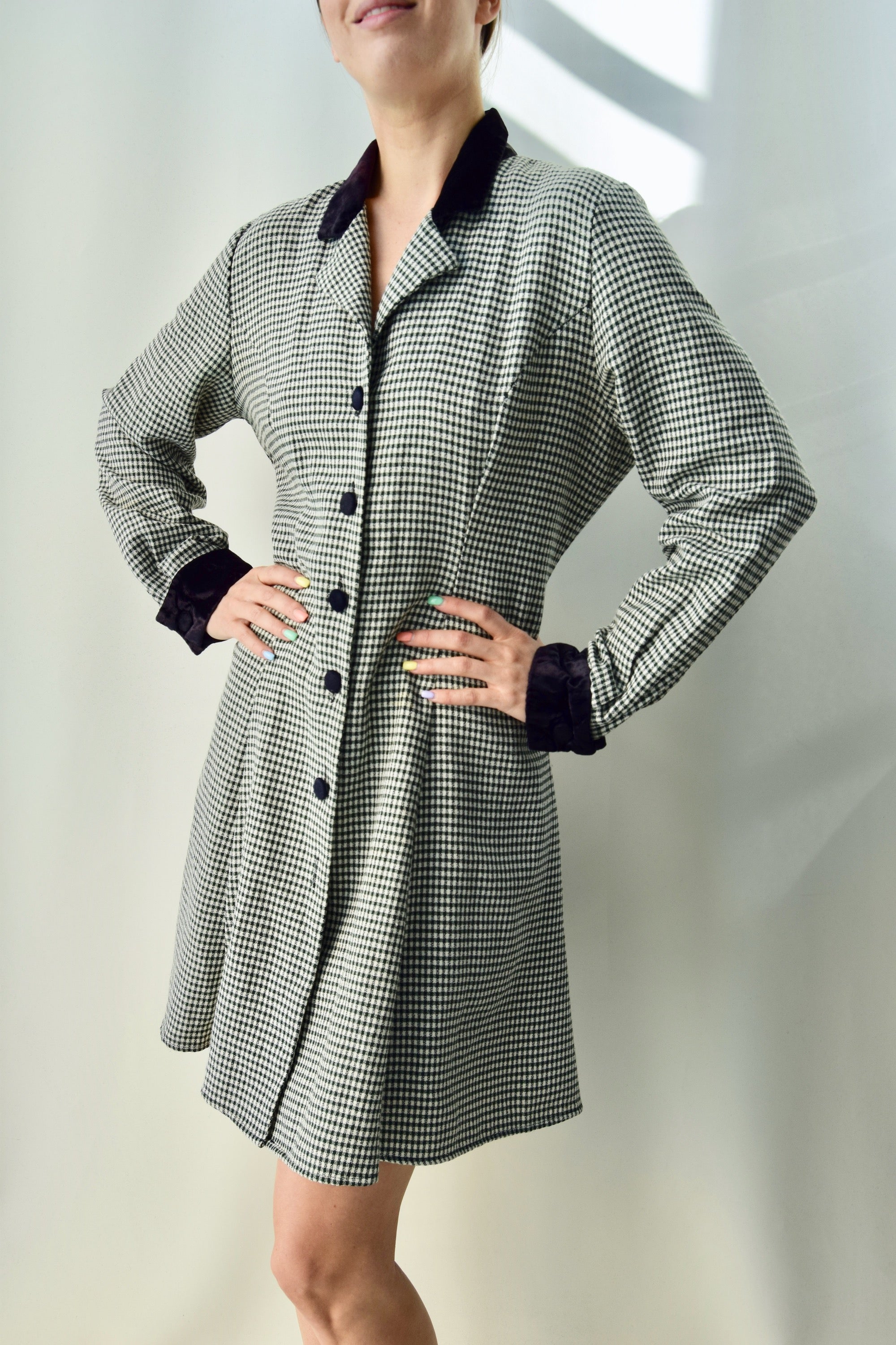 Retro Gingham Dress. Deep Green and White. Washed Black Velvet Detailing on Cuff and Collar. 5 Front Button Closures. (1 Missing) Collared. Back Tie