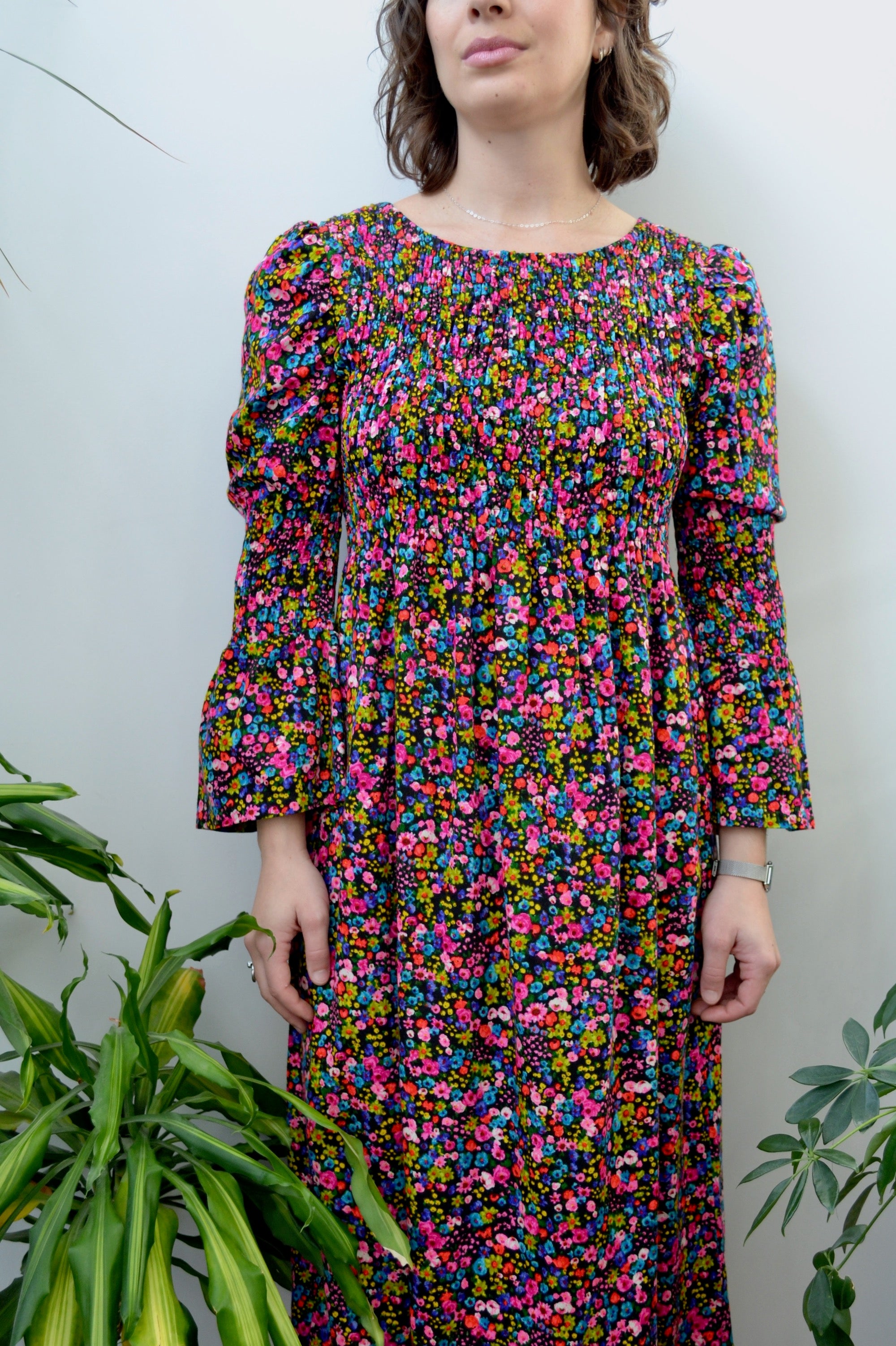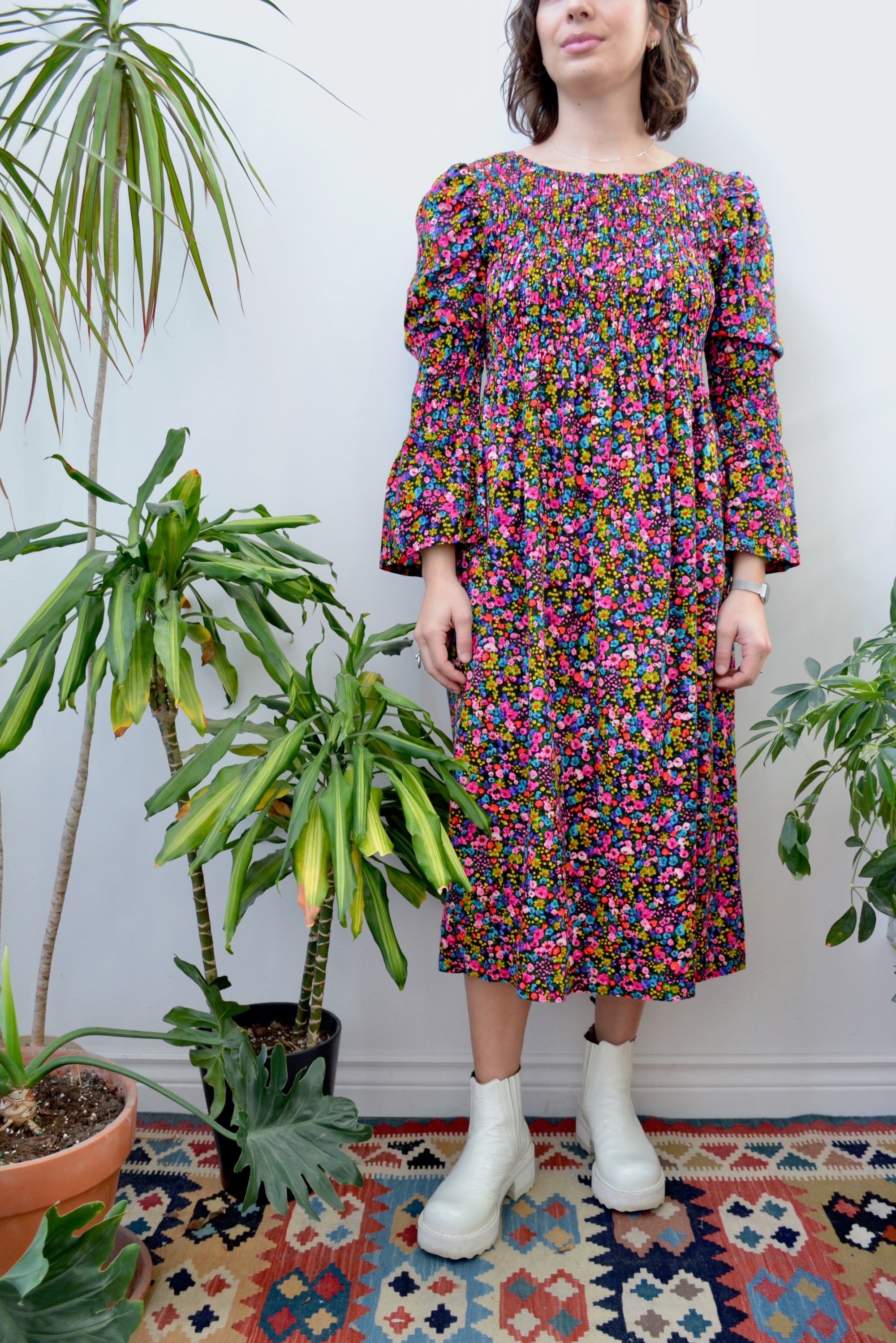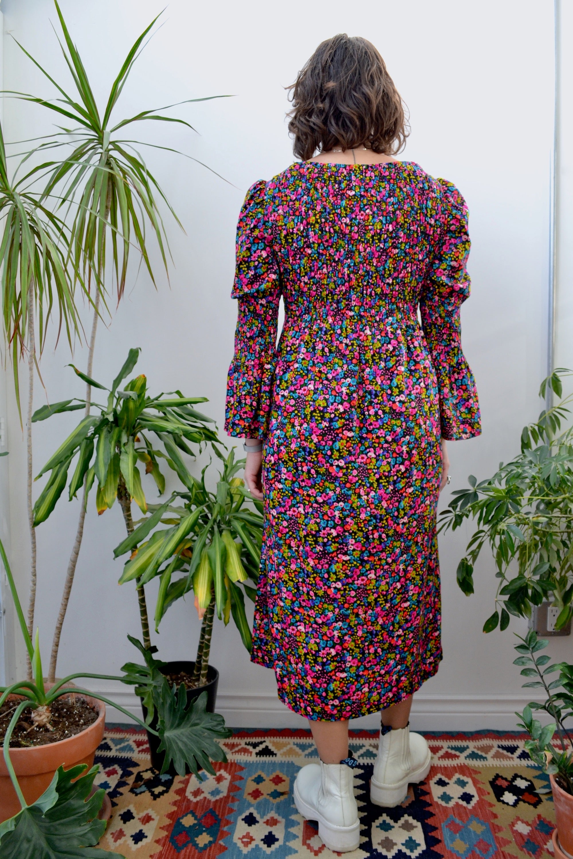 Vintage 1970s Floral Print Dress. Elastic Ruched Bodice and Sleeve Sections. Bell Sleeves. Empire Waist. Unlined.