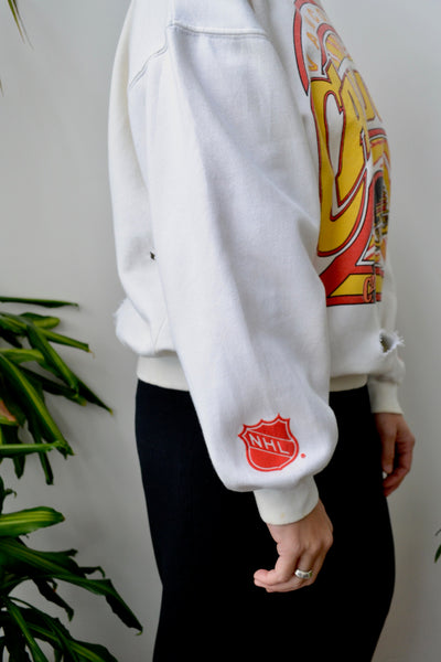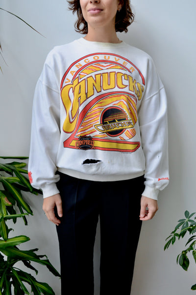 Late 80s/Early 90s Canucks Thrashed Crewneck Sweatshirt. Clarence Campbell Conference. Zubaz Label. NHL Copyright.
