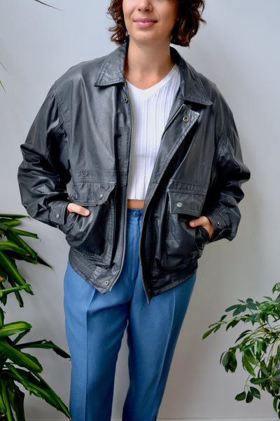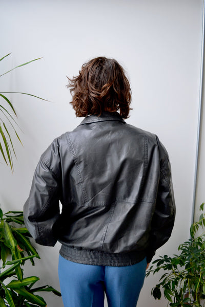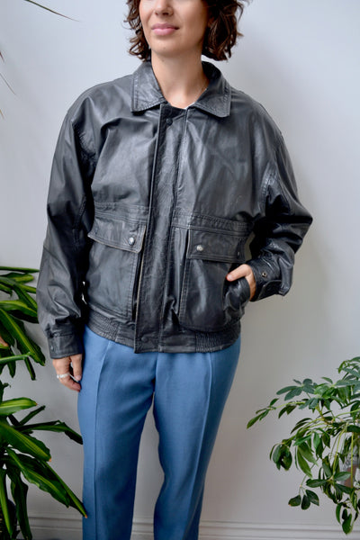 Dark Grey Leather Bomber Jacket. Two Double Pockets. Inside Pocket. Hidden Zipper Closure Up Front. Elastic Waist. Lined.