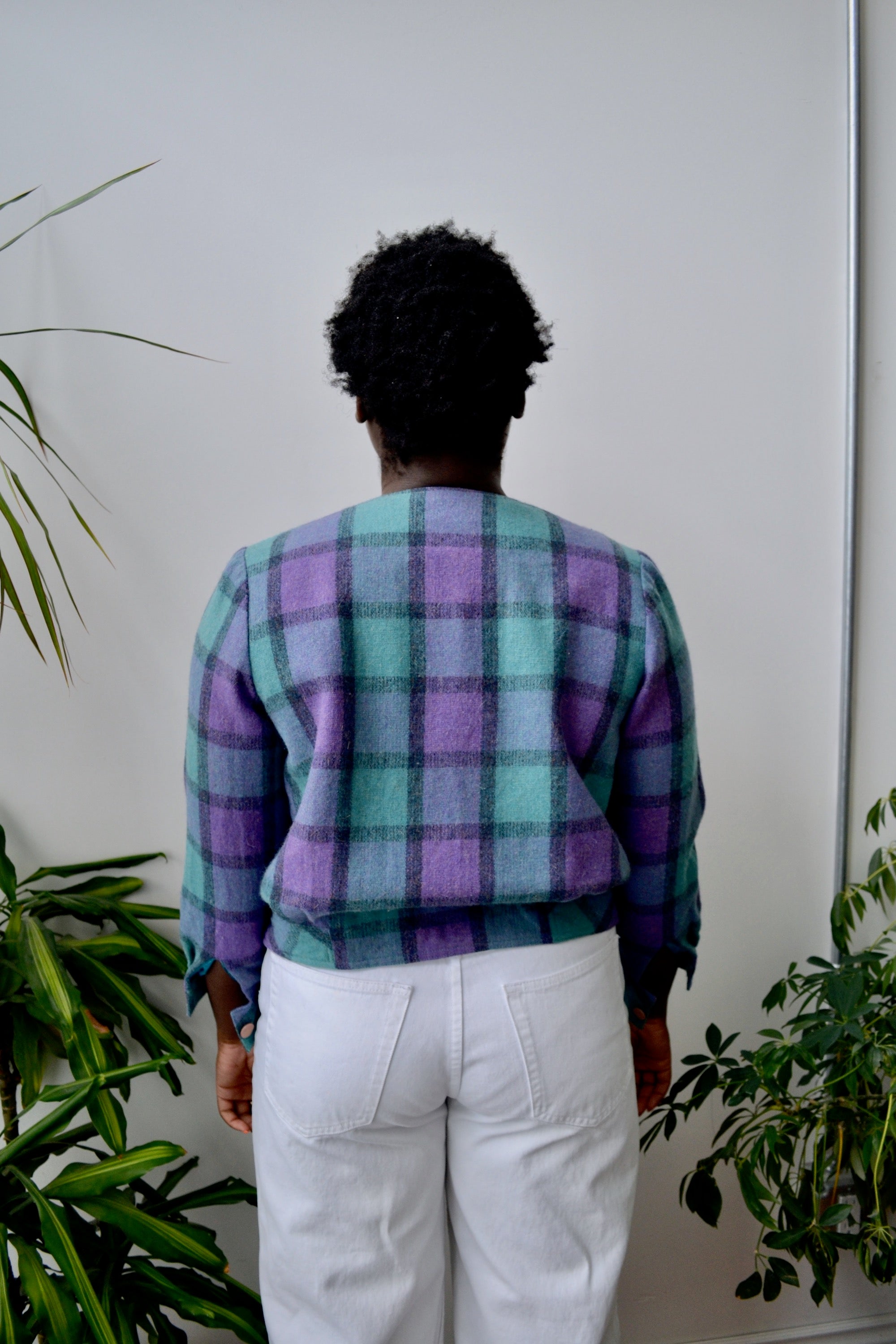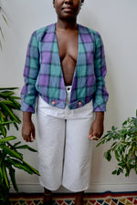Eighties Plaid Bolero Jacket. Collarless. Two Pockets. No Closures. Lined.