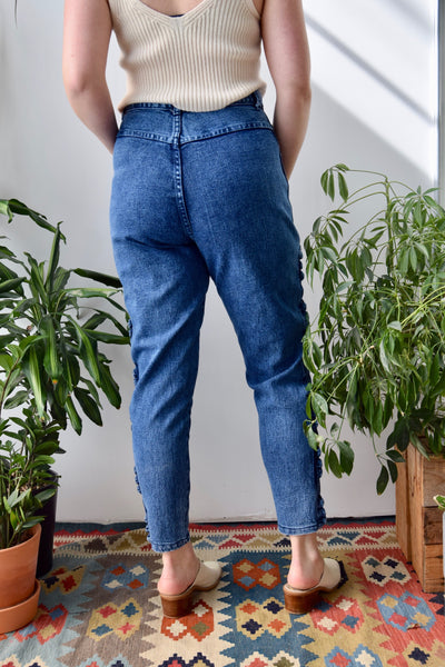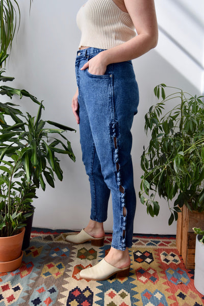 High Waist Eighties Semi Stretch Jeans. Three Pockets On Front. Cut Out Leg Detail. Zipper Fly And Button Waist.