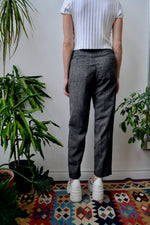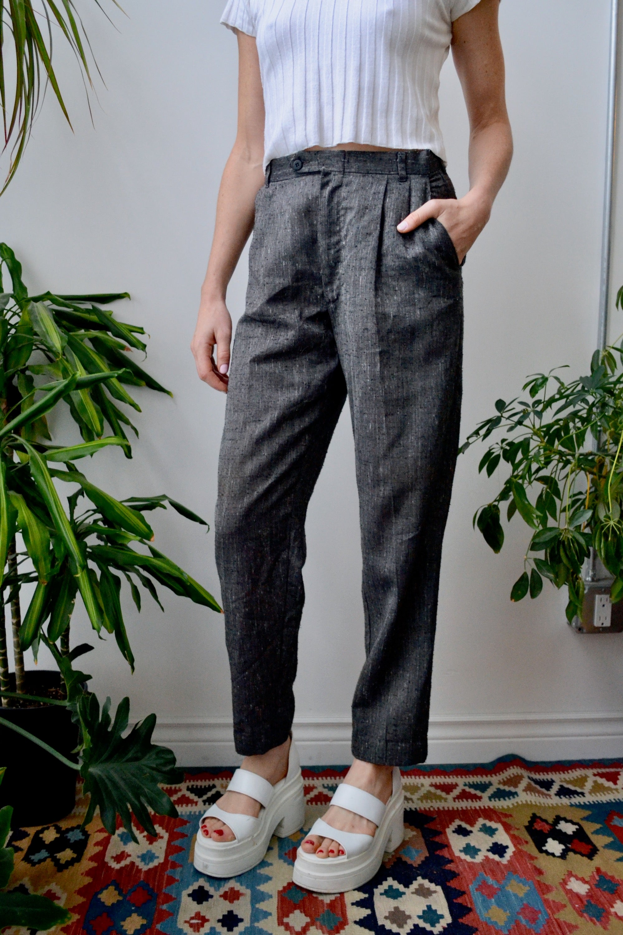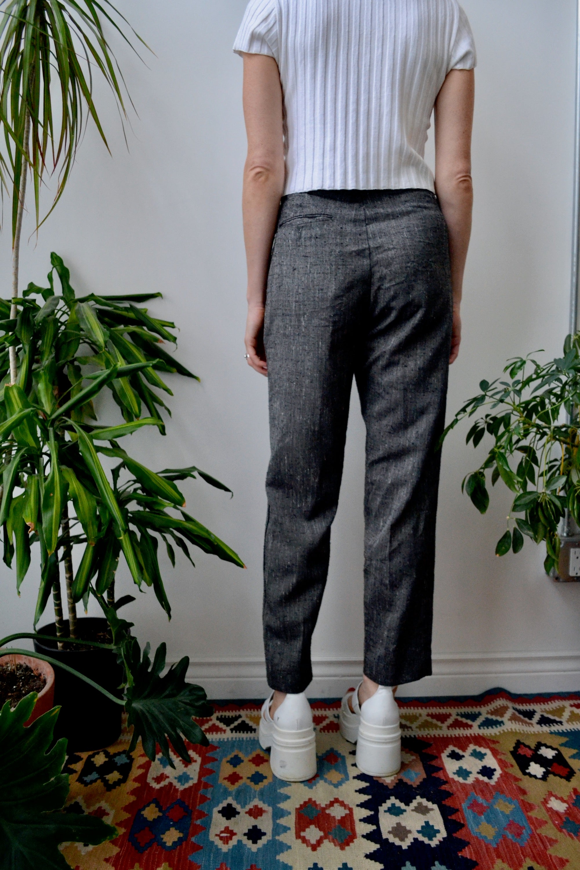 Eighties Grey Speckled Trousers. Zipper Fly. Hook and Eye and Button Waist Closure. Pleated Front. Three Pockets. Slightly Tapered Leg. Unlined.