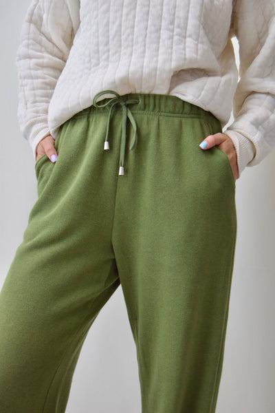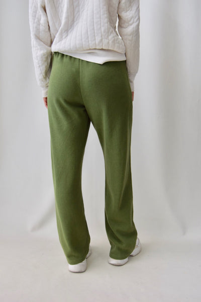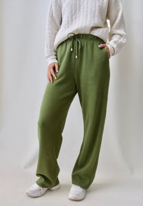 Knit Green Lounge Pants With Elastic Waist And Tie. Two Hip Pockets.