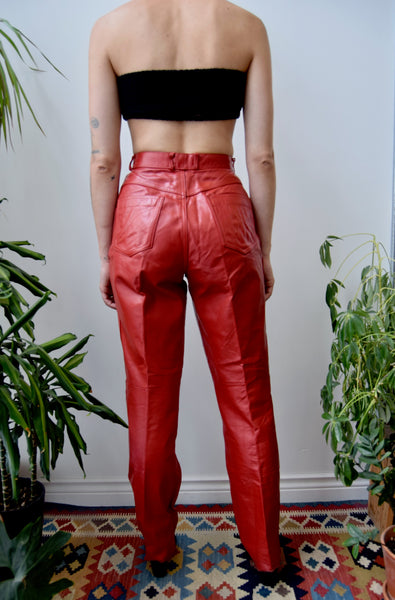 Red Leather Pants. Tapered Leg. Zipper Fly. Button Waist. Five Pockets. Raw Hem. Lined