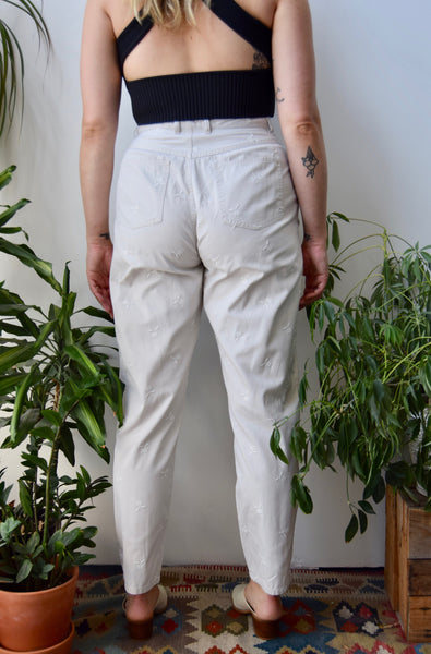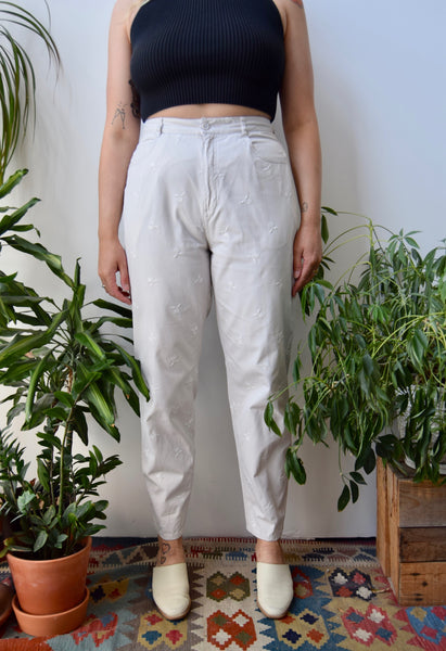 High Waist Straight Leg Cotton Pants. Five Pocket Jeans Style. Zipper Fly And Button Waist.