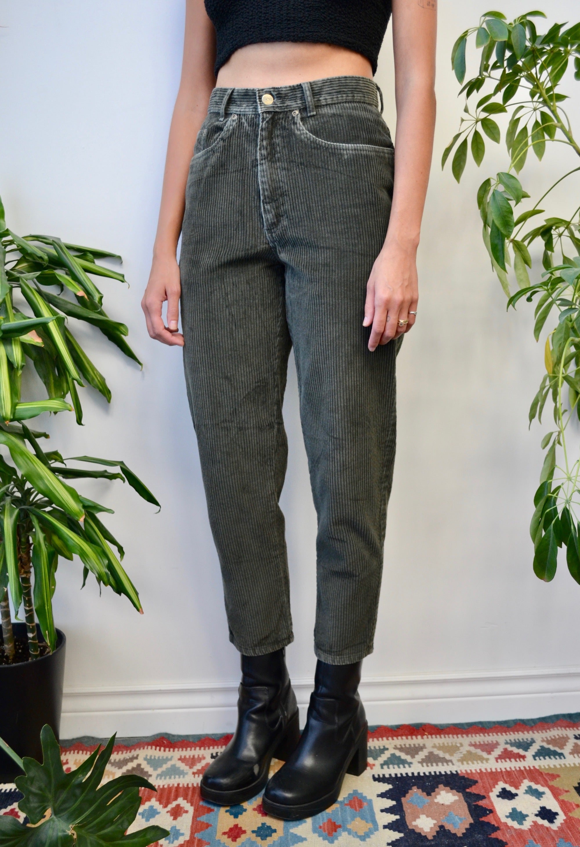 LL Bean Green Corduroy Pants. Zipper Fly. Button Waist. Five Pockets. Tapered Leg. Unlined.