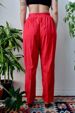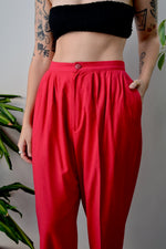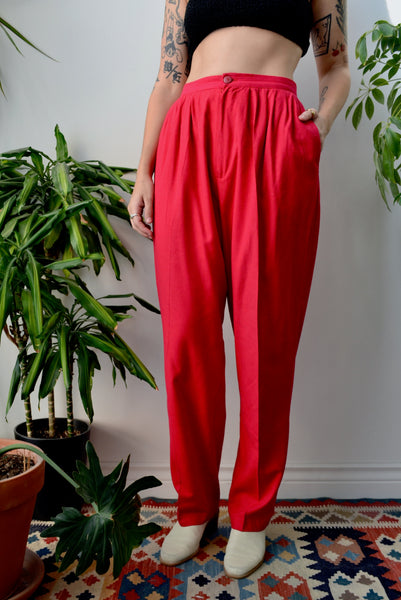Fuchsia Silk Trousers. Pleated Waist. Zipper Fly. Two Hip Pockets. Tapered Leg. Unlined.