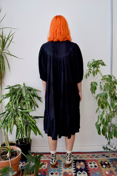 Black Gauze Cotton Summer Dress. Embroidered Pattern Along Chest and Back Shoulders. Balloon Sleeves. Unlined. No Closures.