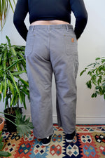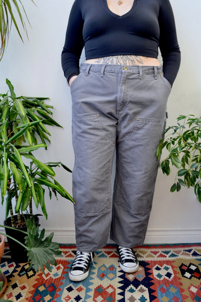 Grey Double Knee Carhartt Work Pants. Zipper Fly. Button Waist. Eight Pockets. Hammer Loop. Loose Straight Leg.