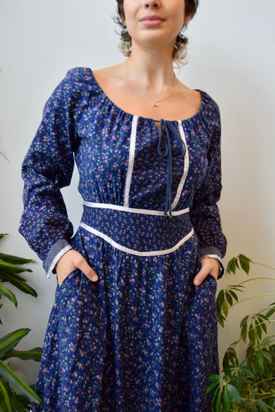 Navy Blue "Gunne Sax" Peasant Prairie Dress. Drawstring Scoop Neckline. Two Hip Pockets. Zipper Closure Up Back. Tie Sash Detail. Unlined.