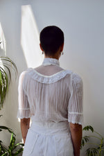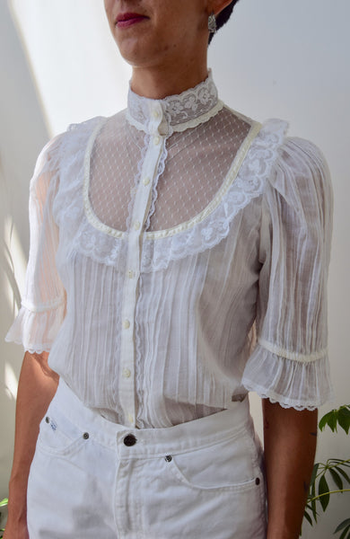 1970's Gauzy Gunne Sax Blouse. High Neck. Lace Collar. Lace Ruffles. Button Closure Along Front.